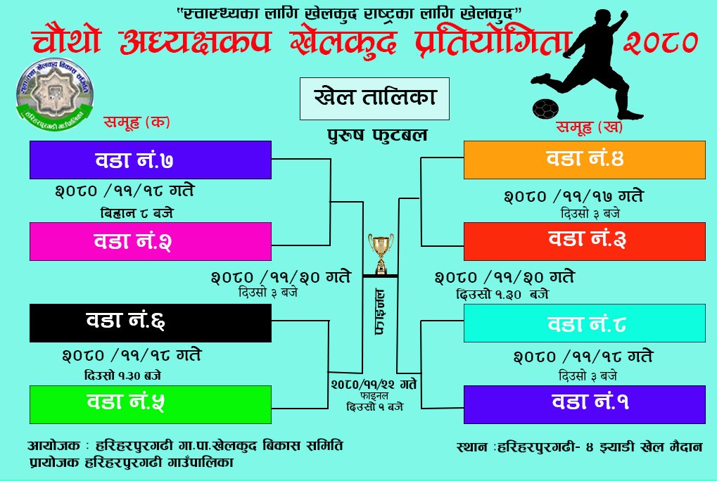 तर्फ दिउसो समुह (ख) को ३ बजे वडा नम्बर ४ र वडा नम्बर ३ बीच १ खेल हुने छ भने १८ गते दुइ खेल हुनेछ जसमा बिहान ८ बजे वडा नम्बर ७ र वडा नम्बर २ खेल हुनेछ त्यस्तै दिउसो १.३० बजे वडा नम्बर ६ र वडा नम्बर ५ बीच हुनेछ।त्यस्तै महिला फुटबलको खेल फागुन १९ गते हुनेछ हरिहरपुरगढी युबा तथा खेलकुद बिकास समितिको आयोजना तथा हरिहरपुरगढी गाउँपालिकाको मुख्य प्रायोजनमा गाउँपालिका स्तरिय खेलकुद प्रतियोगिता हुन लागेको हो।